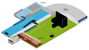 Serão três níveis conectados por escadas e rampas com acessibilidade, conforme mapa acima. A área do gramado onde fica a piscina com toboágua não será mais utilizada. As quadras poliesportivas continuarão sendo utilizadas, e a entrada será realizada pela mesma portaria em frente ao Parque Guanabara.
